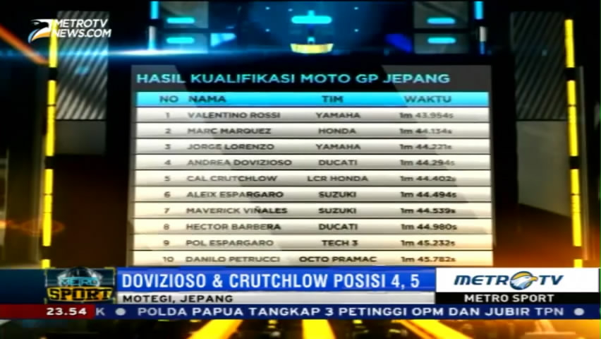 Valentino Rossi akan memulai start terdepan dalam seri MotoGP Jepang setelah tampil tercepat dalam sesi kualifikasi. Meski meraih pole position, Rossi masih mengalami kendala dalam performa motornya. Cek Berita dan Artikel yang lain di Google News