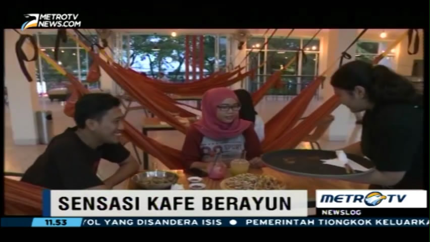 Sebuah kafe memberikan sensasi makan yang berbeda. Pengunjung dapat menikmati sajian makanan sambil berayun di hammock, Minggu (8/5/2016).