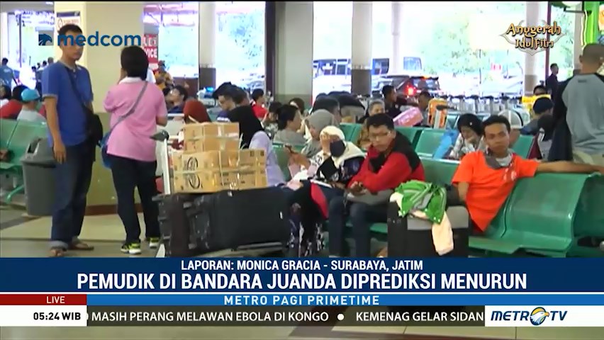 Sehari jelang Lebaran, pemudik di Bandara Juanda, Sidoarjo diperkirakan akan mengalami penurunan sekitar 50 ribu-70 ribu penumpang. Dari data yang dihimpun, total 406.076 pemudik yang berangkat maupun tiba di Bandara Juanda. Cek Berita dan Artikel yang lain di Google News