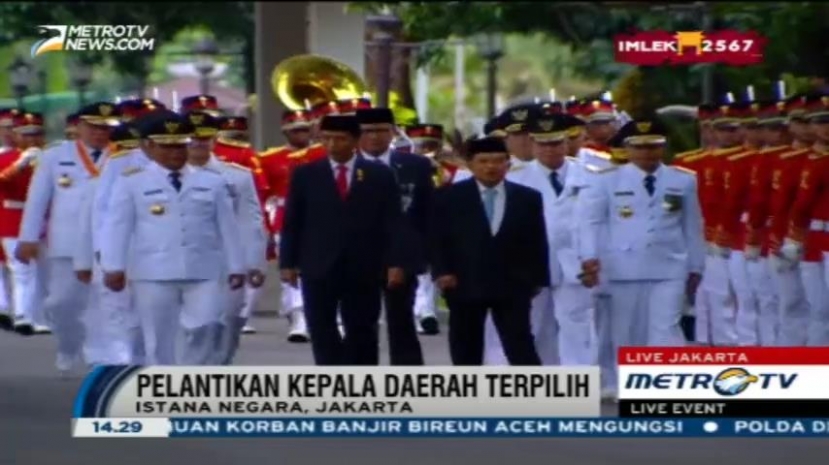Pelantikan tujuh Gubernur dan Wakil Gubernur yang berlangsung di Istana Negara kali ini disertai dengan prosesi Kirab yang dilakukan oleh Presiden Joko Widodo dan Wakil Presiden Jusuf Kalla bersama Menteri Dalam Negeri Tjahjo Kumolo, Jumat (12/2/2016).