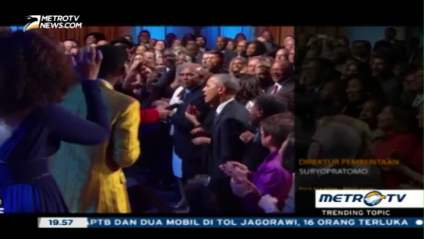 Presiden AS, Barrack Obama unjuk suara bersama istrinya dalam konser penghormatan Musisi legendaris soul dari Amerika Serikat Ray Charles, Senin (29/2/2016). Cek Berita dan Artikel yang lain di Google News