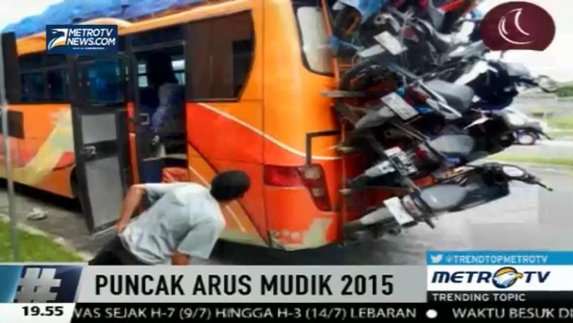 Berbagai cara dilakukan pemudik untuk bisa sampai di kampung halaman. Seperti yang satu ini, dimana bis ini dipenuhi motor penumpang, Rabu (15/7/2015). Cek Berita dan Artikel yang lain di Google News