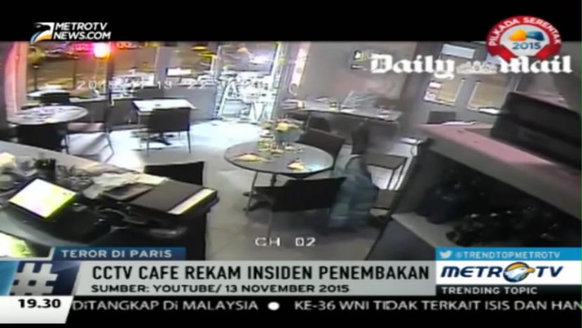 Sebuah rekaman cctv menunjukkan insiden penembakan di sebuah cafe di Paris. Seorang pria dengan wajah tertutup terlihat memasuki kafe dan menembakan senjata AK 47 kepada seseorang yang hendak memasuki cafe tersebut, Kamis (19/11/2015). Cek Berita dan Artikel yang lain di Google News