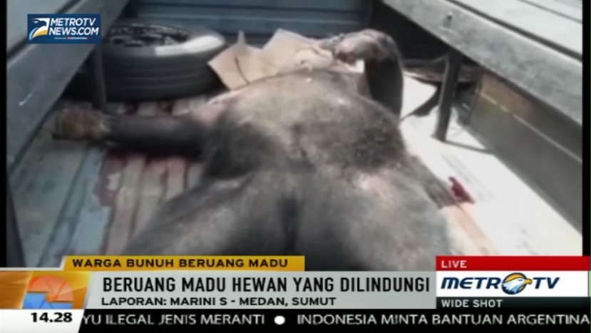 Seekor beruang madu di Rokan Hulu, Riau dibunuh warga setempat. Pembunuhan hewan yang dilindungi tersebut dipicu kekhawatiran warga beruang akan menyerang, Selasa (10/3/2015). Cek Berita dan Artikel yang lain di Google News