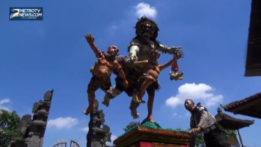 Belasan anggota Brimob sibuk menyiapkan sebuah ogoh-ogoh di Pura Prajapati Purna Pralina, Depok, Kamis (19/3/2015). Ogoh-ogoh Shang Hyang Kala setinggi 3,5 meter dengan berat 20 Kg ini akan dibuat sebagai bagian prosesi menyambut hari raya Nyepi yang jatuh pada Sabtu lusa.